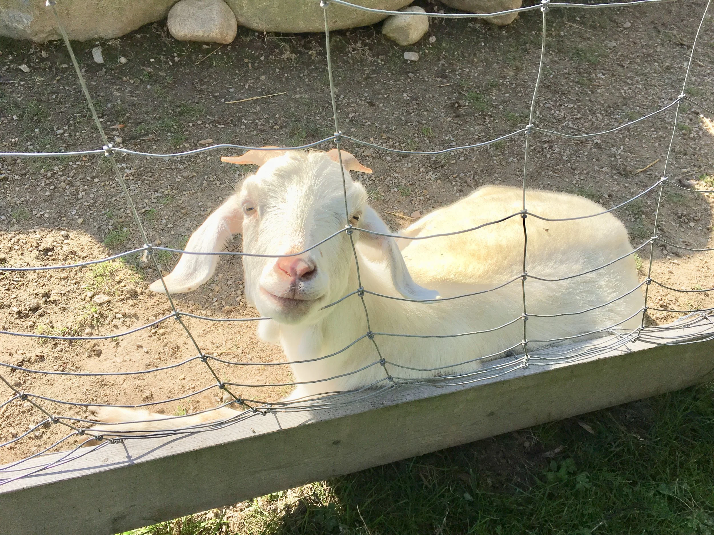 This farm has lots of adorable animals. The animals we saw: gooses, chickens, and goats. The gooses and chickens wander around the farm and market. Goats are in fenced area but were friendly enough for us to pet it.