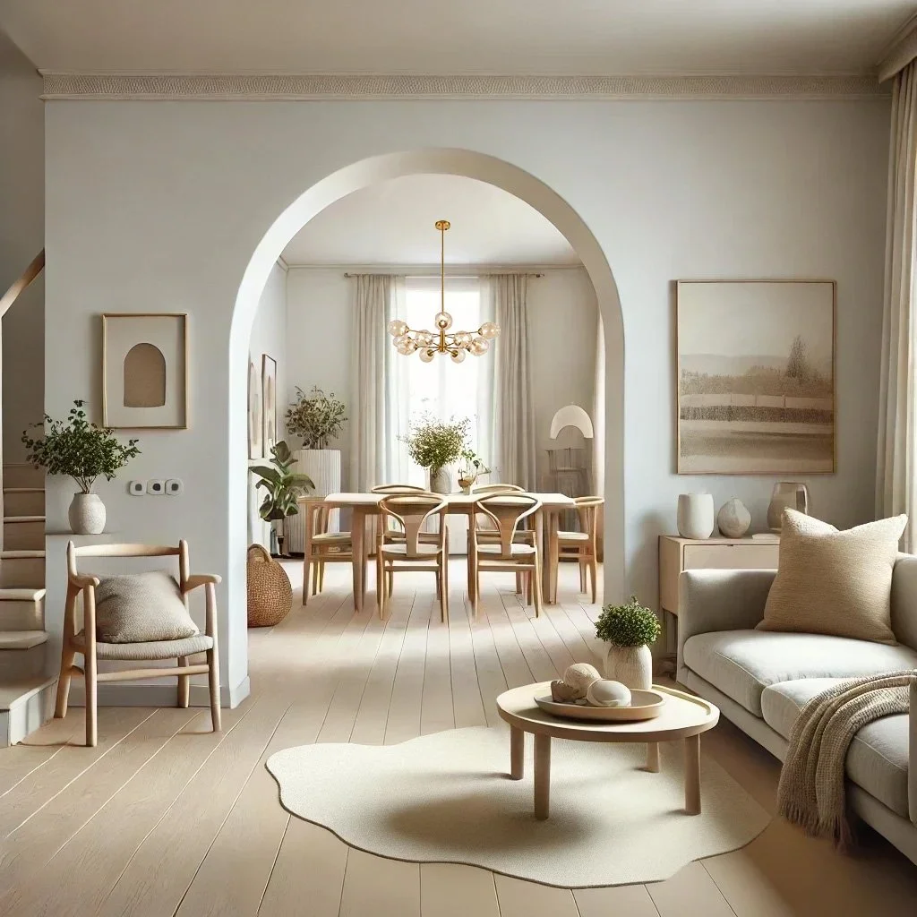 Scandinavian style home with archway leading from the living room into the dining room. AI image generated with some edits by interior designer Joshua Jones of JJones Design Co.