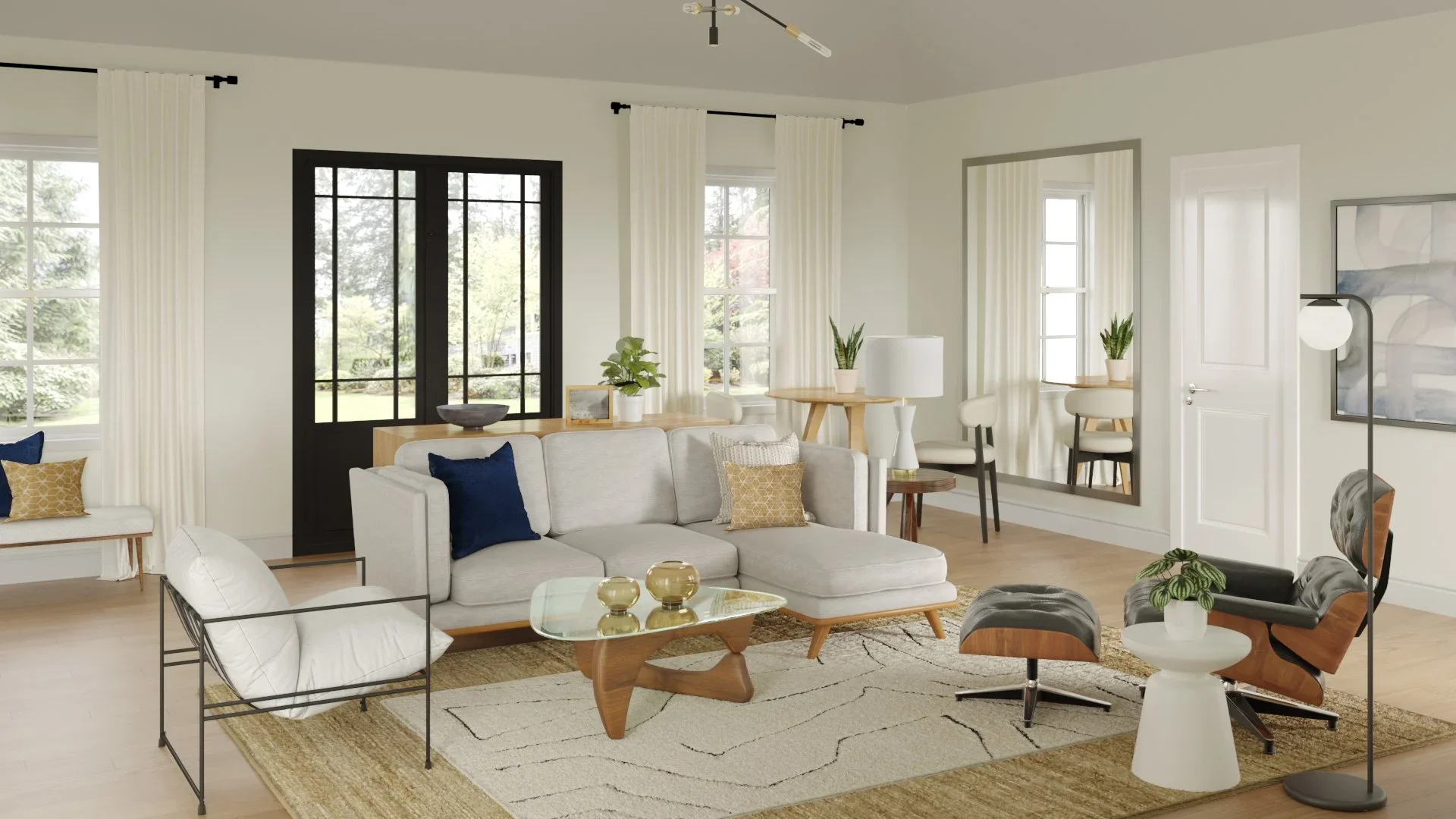 A bright and welcoming mid-century modern beach house living room designed by virtual interior designer Joshua Jones of JJones Design Co. The layered textures, light walls, and sleek furniture show how to create a naturally bright space that feels cozy and refined even in winter.