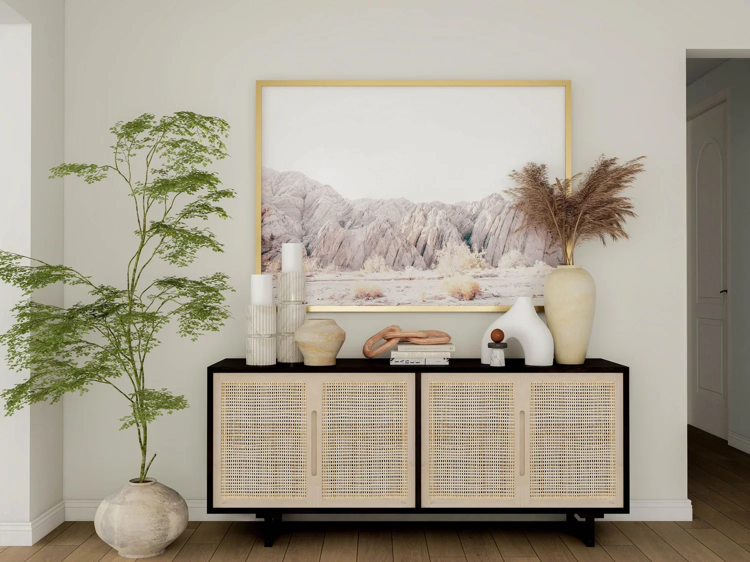 Photorealistic 3D rendering of a California casual entryway designed by virtual interior designer Joshua Jones of JJones Design Co., showcasing intentional wall art placement above the console for a polished and cohesive look.