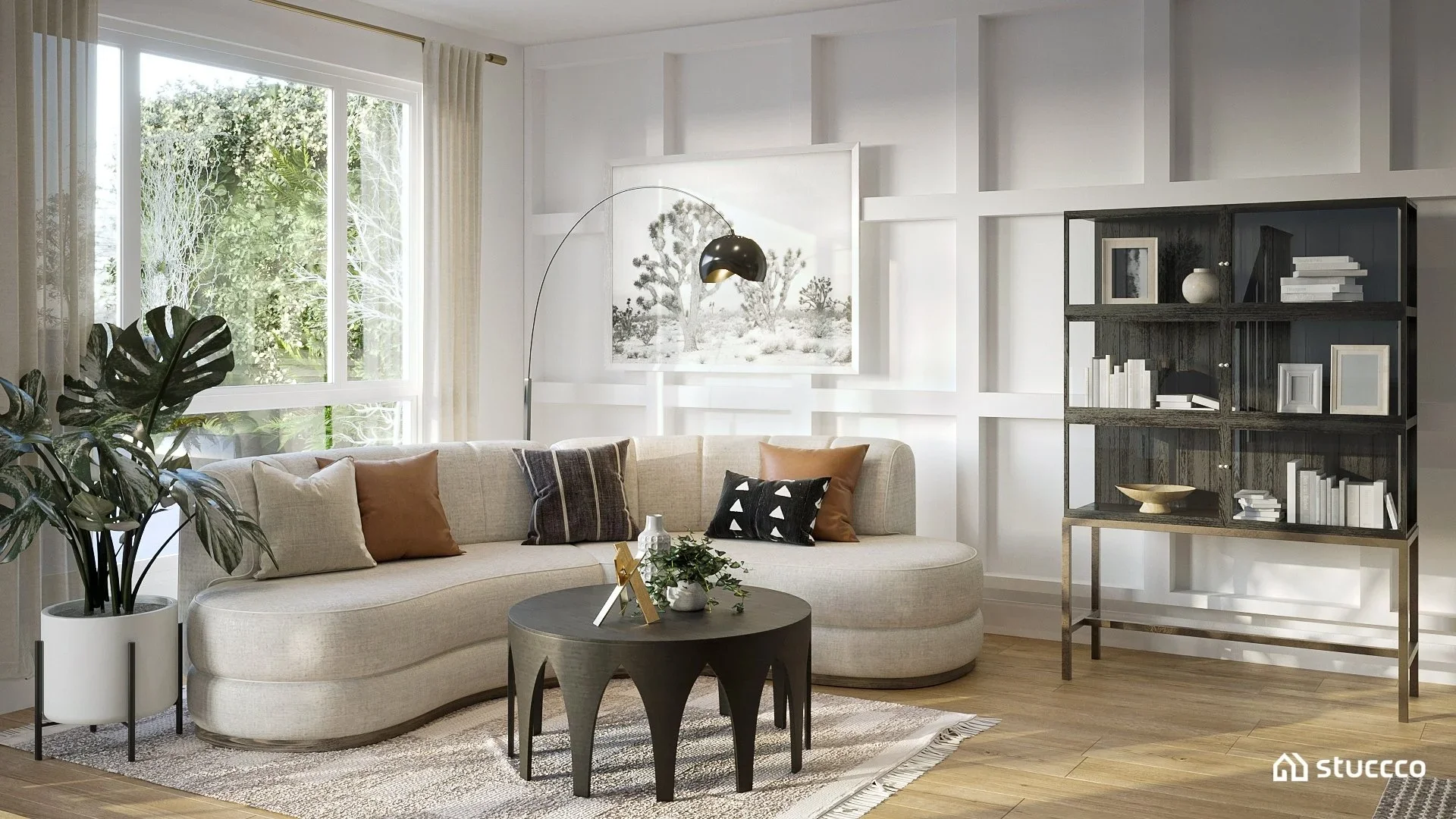 Photorealistic 3D rendering of a California casual living room designed by virtual interior designer Joshua Jones of JJones Design Co., created in collaboration with Stuccco. The artwork above the sofa illustrates proper wall art placement height.