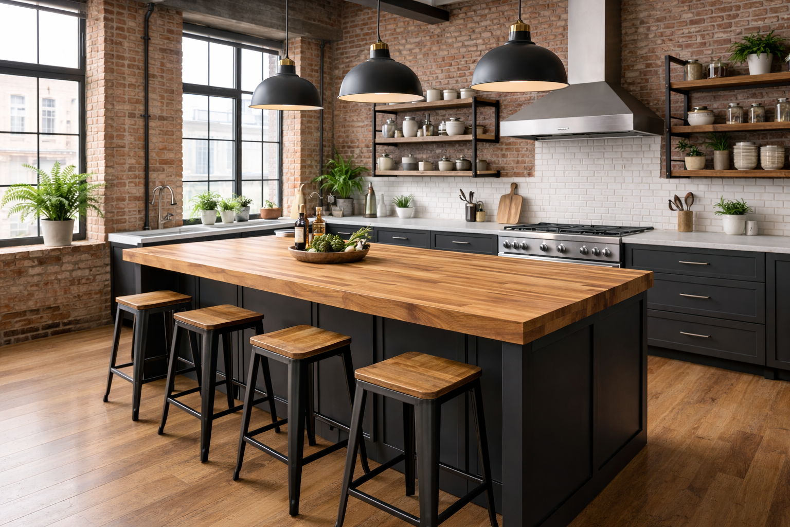 Industrial-style loft kitchen featuring a butcher block wood island countertop. AI-generated image.