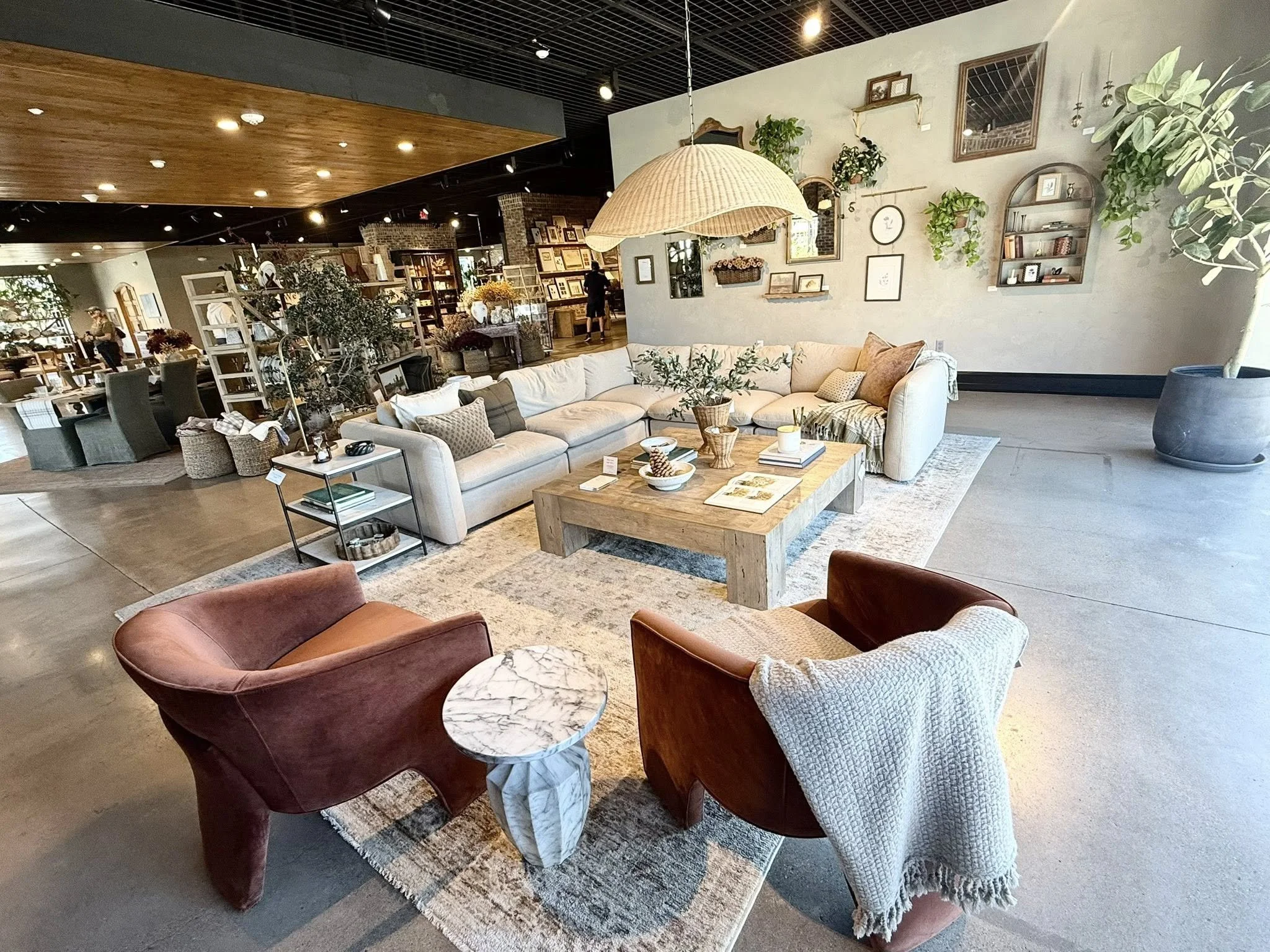 Living room showroom inside Magnolia Home in Waco, Texas, featuring cozy neutral furniture, rustic accents, and layered wall décor. (Photo credit: Joshua Jones)