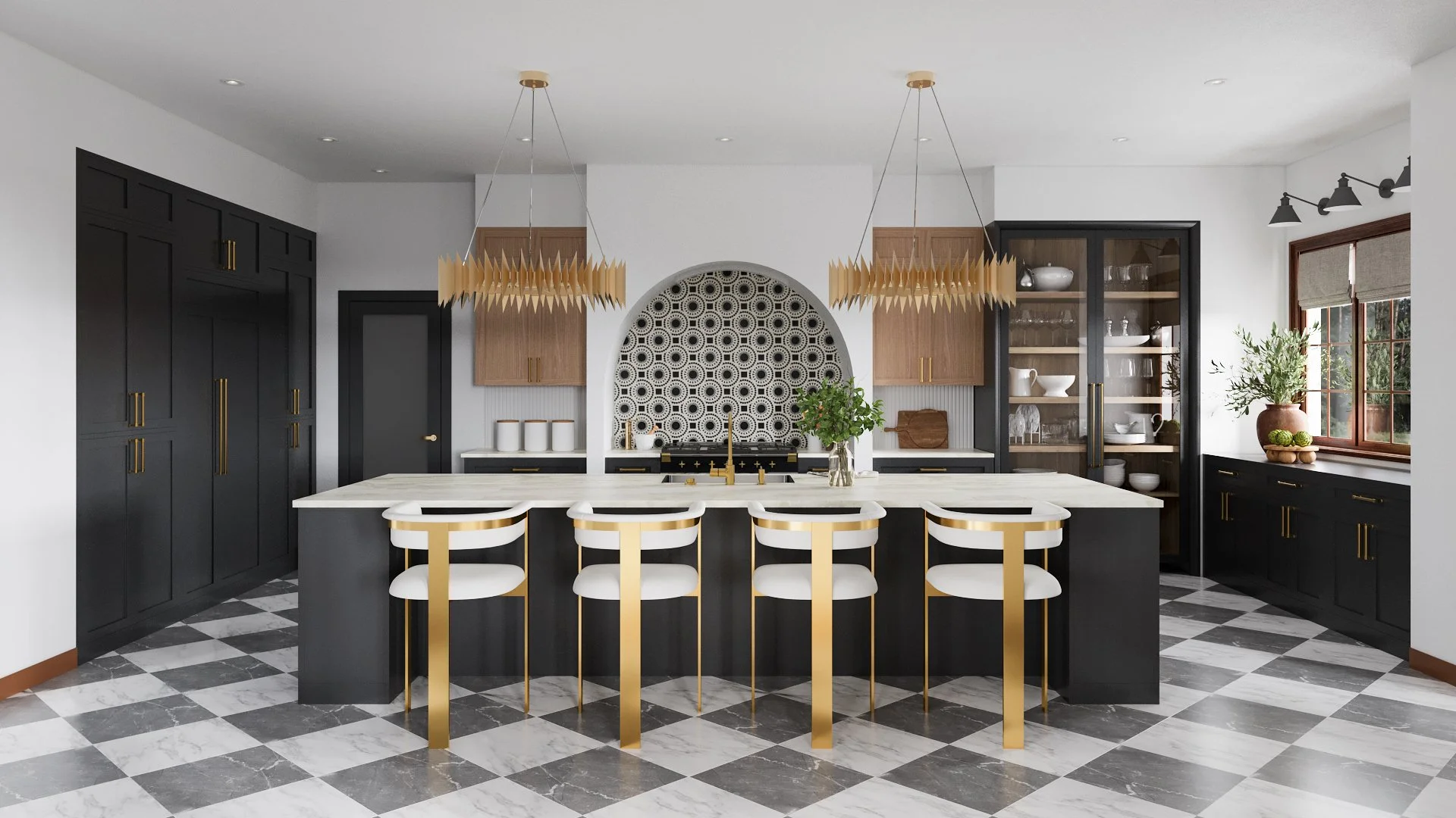 Luxury modern kitchen with Art Deco influence designed by virtual interior designer Joshua Jones of JJones Design Co., featured in Architectural Digest.
