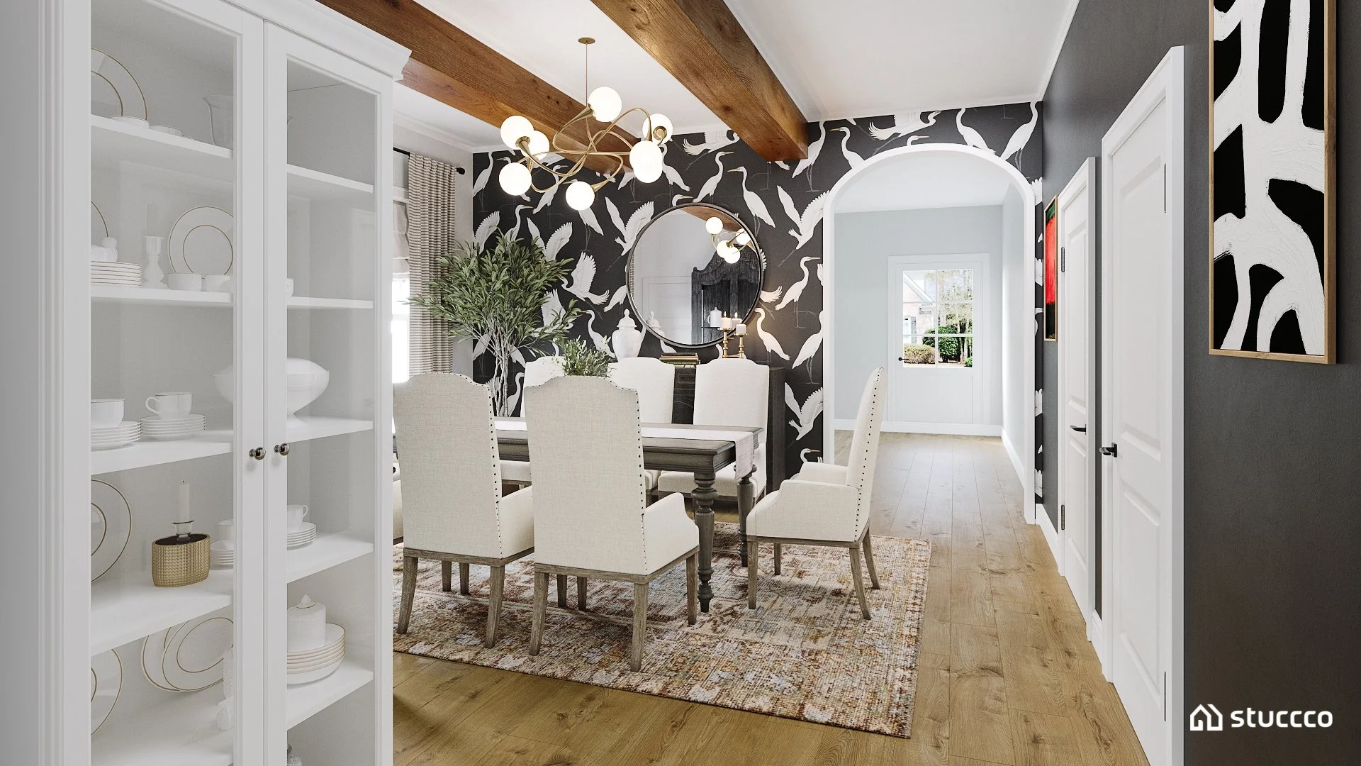 Eclectic-style formal dining room with a whimsical touch, designed by Joshua Jones of JJones Design Co. The 3D rendering was created by Stuccco.