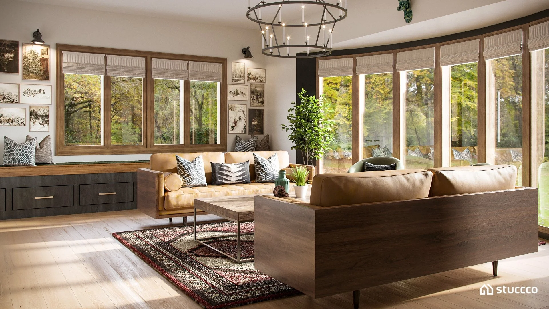 Mid-century modern style living room designed by Joshua Jones, JJones Design Co. Rendering by Stuccco.